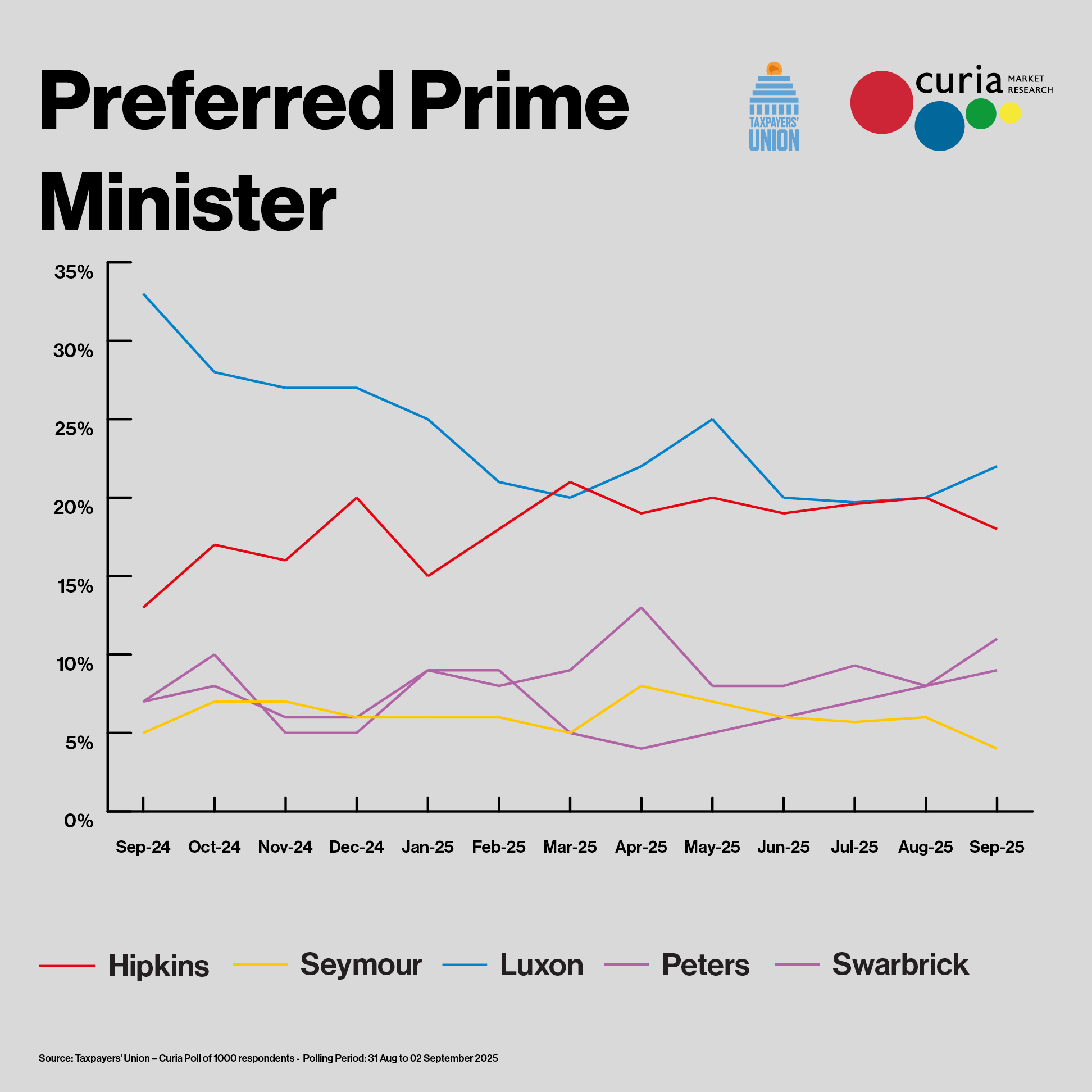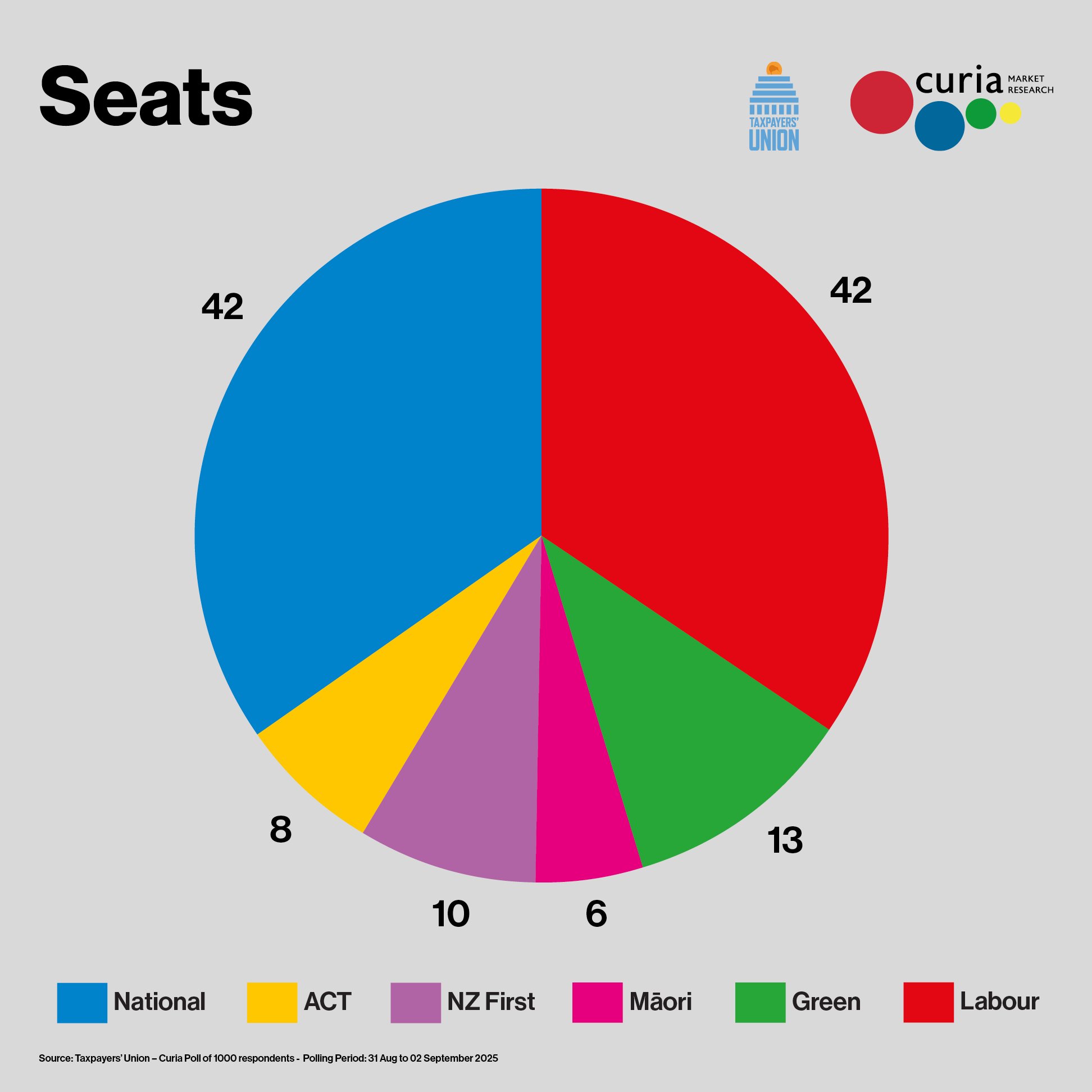 The poll was conducted by Curia Market Research Ltd for the Taxpayers’ Union. It is a random poll of 1,000 adult New Zealanders and is weighted to the overall adult population. It was conducted by phone (landlines and mobile) and online between Sunday 31 August and Tuesday 02 September 2025, has a maximum margin of error of +/- 3.1% and 8.2% were undecided on the party vote question.