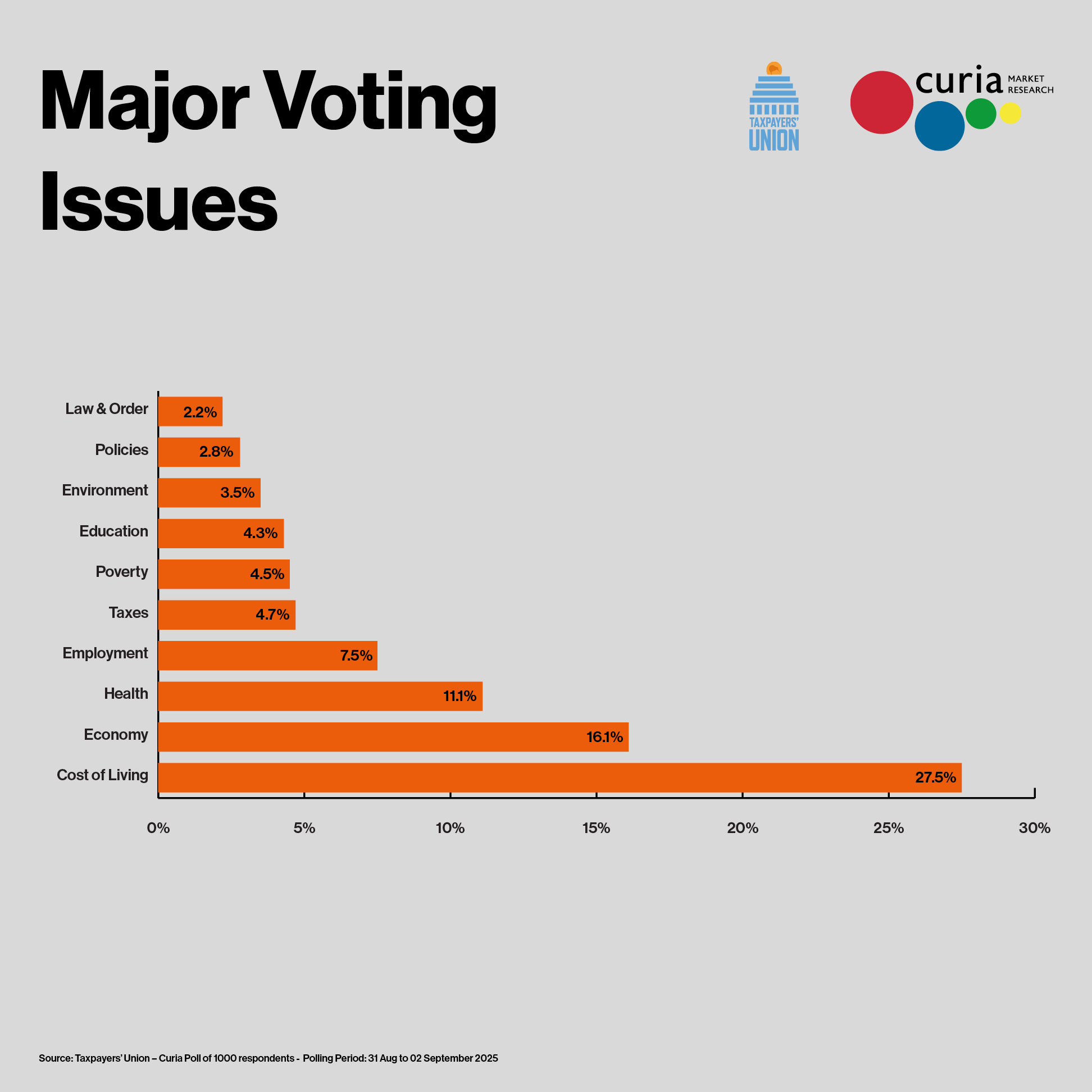 The Taxpayers’ Union – Curia Poll was conducted from Sunday 31 August and Tuesday 02 September 2025. The median response was collected on Monday 01 September 2025.